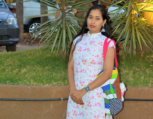 So I came up with the concept of a cotton white kurta with beautiful floral prints on it. In addition, it is spiced up with Chikan work around floral prints which gives the fabric a rich and defined look. This kurta has been stitched in a closed neck pattern, inspired by Chinese style which gives it a very decent look, and why not closed neck are too trending up this season. I paired this with maroon-colored legging which slightly matches with the floral print color of my kurta.