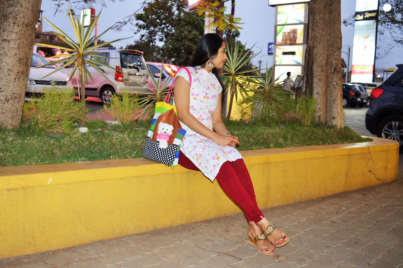 For a cute girly look, I just grabbed my color pop handbag that has a cute little teddy on it and wore slightly heeled sandals that had embroidery work. I got this baggy in Vishal Mega Mart in Panaji, Goa. For others, you can find similar ones online at Flipkart.
