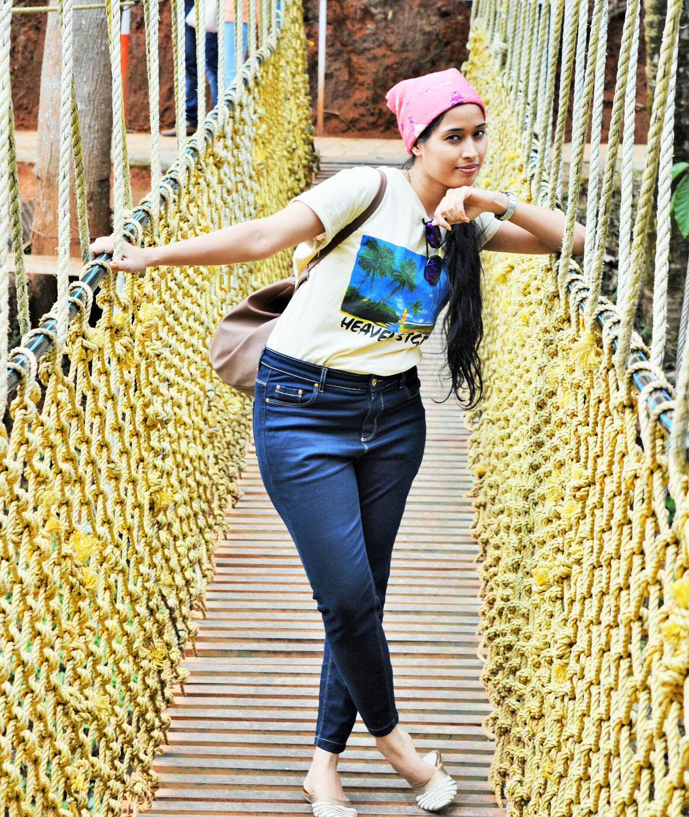 In my case, I switched on to casual street look. I wore a comfy cotton cream colour T top as a base with beautiful print which had a quote “Heavenest Goa” instead of just plain T top as I was missing goa so much and I wanted that goan feel, so I choose to wear this. You will find similar T top in beach side stalls of Goa. I layered it up with a black and grey stripped Shrug, which was been picked up from ”Xtend” clothing and accessories store, Panaji. I paired these with my favorite dark blue high waist Denim jeans from ”Westside” which is stretchable, very comfortable to wear and I just love the way it fits me.