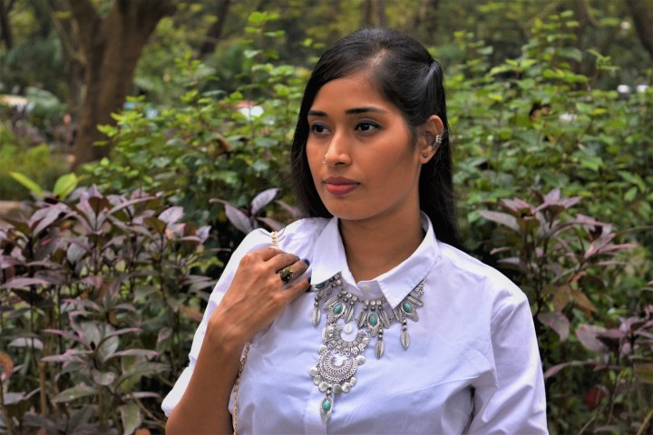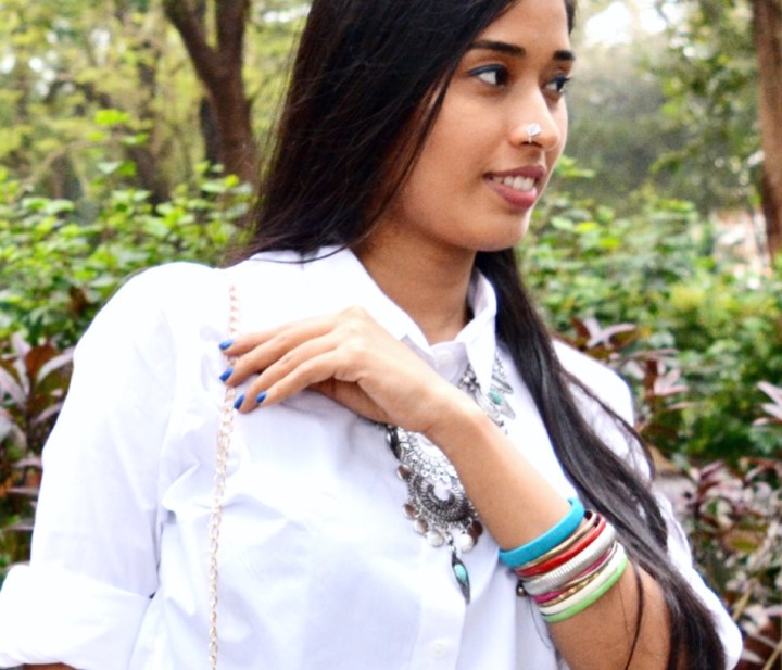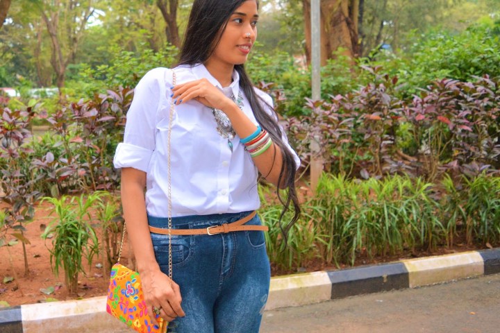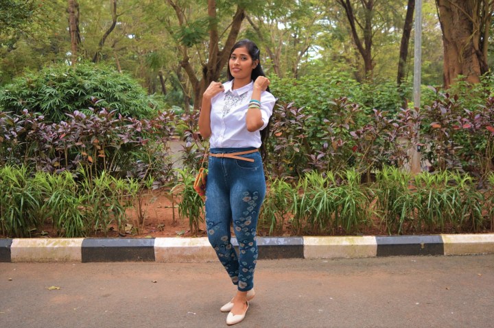Talking about my looks, to attain a perfect Indo-Western attire, I wore a plain white shirt and paired it up with denim leggings with floral prints on the sides, which gave me a clear chic style. In order to create more interesting look and bring out Indian vibe, I added on a statement neckpiece, nose ring, colorful bangles and kept minimal for ears with simple pair of studds and ear cuffs. To complete my look, I picked up a sling bag and finally neutral belles were good enough to go with.