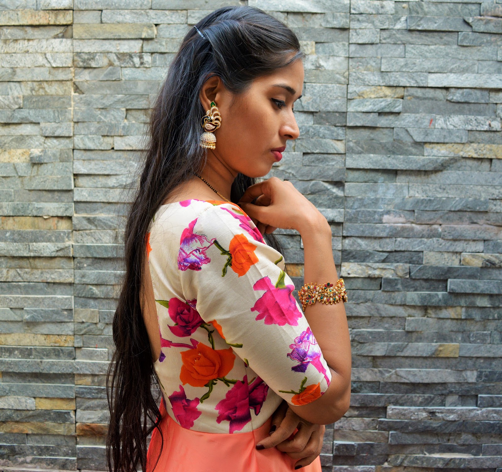 I love long, free flowing dress as it’s elegant and surreal which accentuates femininity in you and floral rose prints was an icing over a cake. No Indian festive look is complete without ornaments as it also elevates the beauty of women. So I paired a beautiful pair of pearl peacock jhumkas and a bangle for a traditional Indian vibe and yes…I have to mention my hairstyle did complement my feminine look along with this beautiful dress.