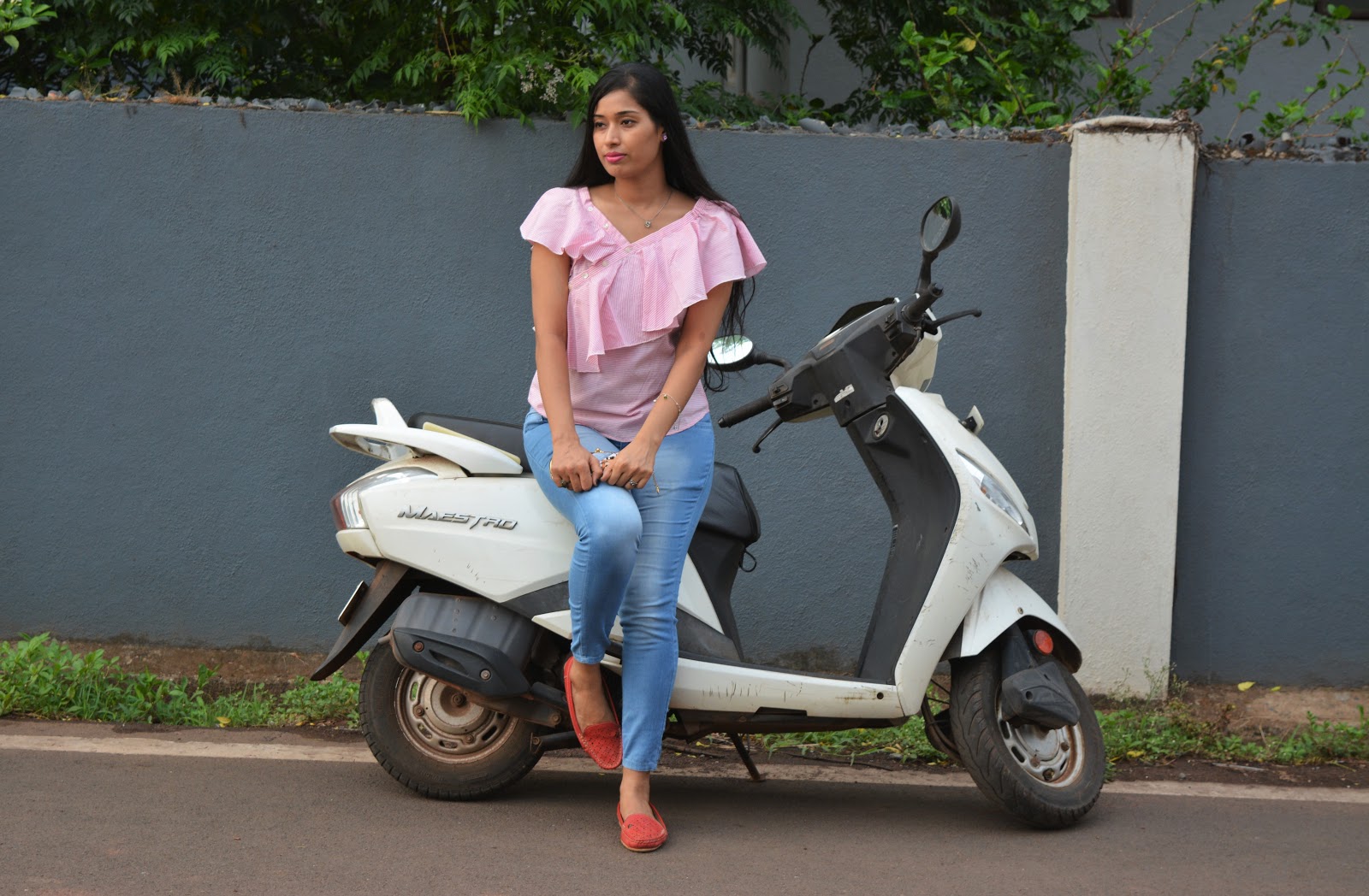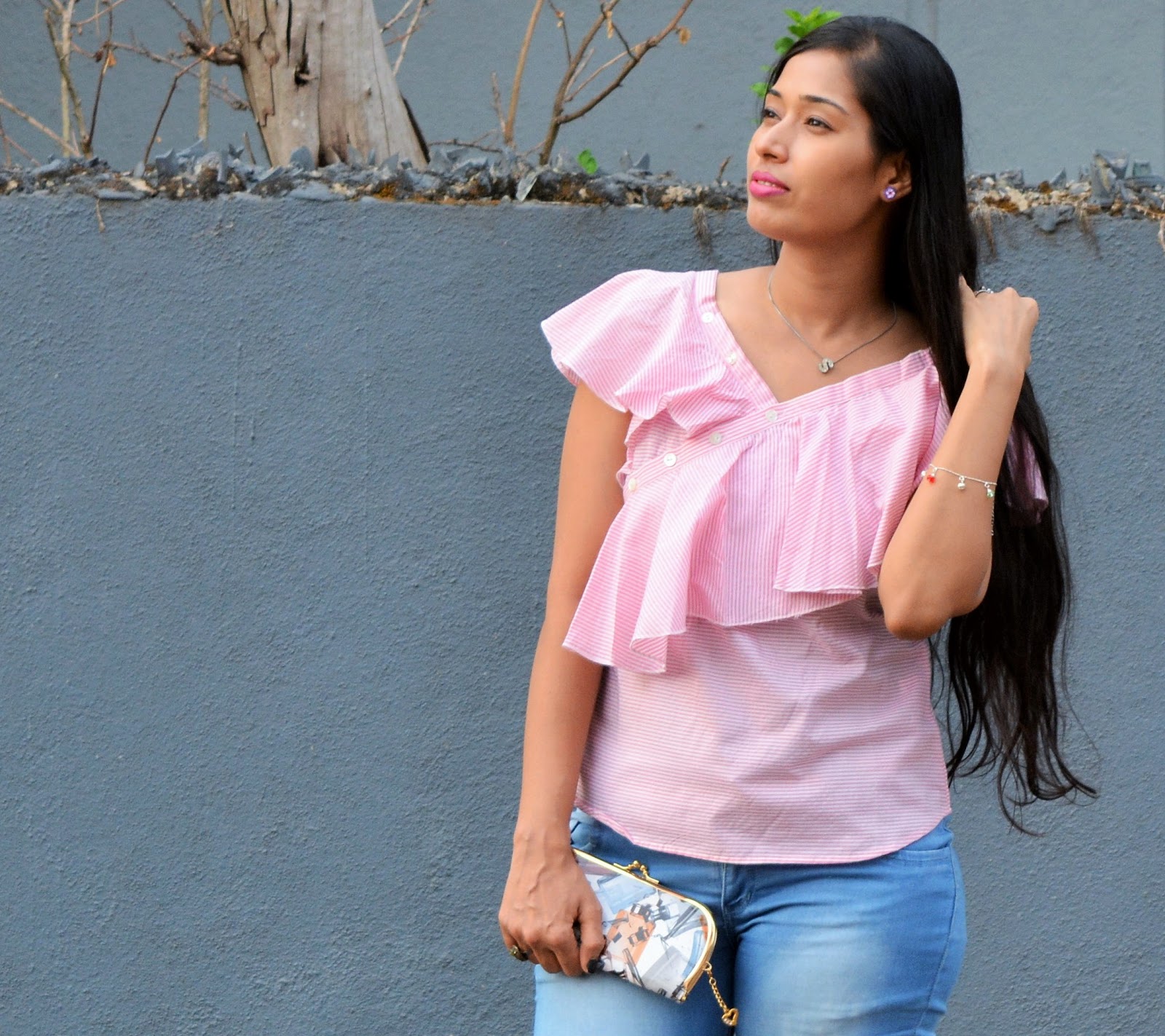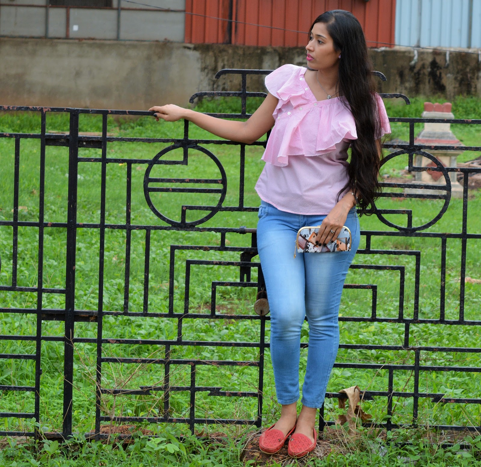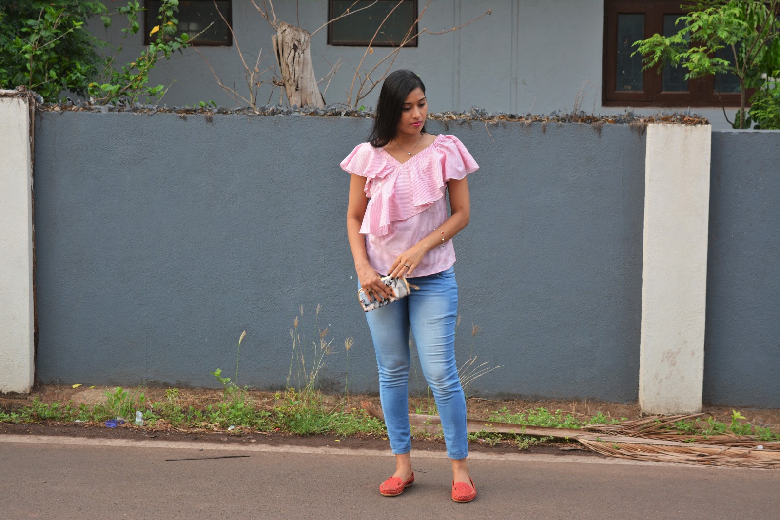 Like this super comfy top, I paired with denim pants and matching loafers. The flares and neck pattern defines the uniqueness of this top. It has elastic on side of neck line, so that, it can be worn as an off shoulder top. Depending upon your mood, you can flaunt two different looks with same top.
