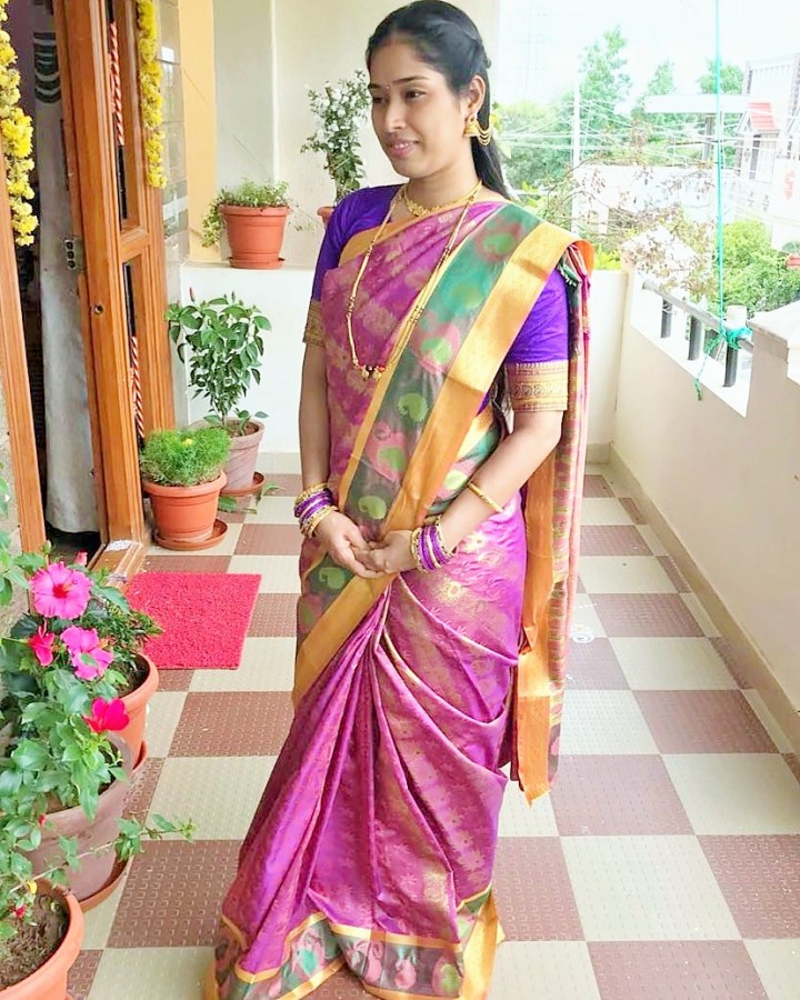 Now coming back to the auspicious day look. I wore a raw silk saree of quite soft texture, with a beautiful pink shade from Saroj collections, Panjim, Goa., which was gifted to me. The beautiful pink shade and thick border with beautiful shades of green and pink leaves was the main highlight of this saree. Intricate gold designs covered the saree body overall, including the pallav.Â