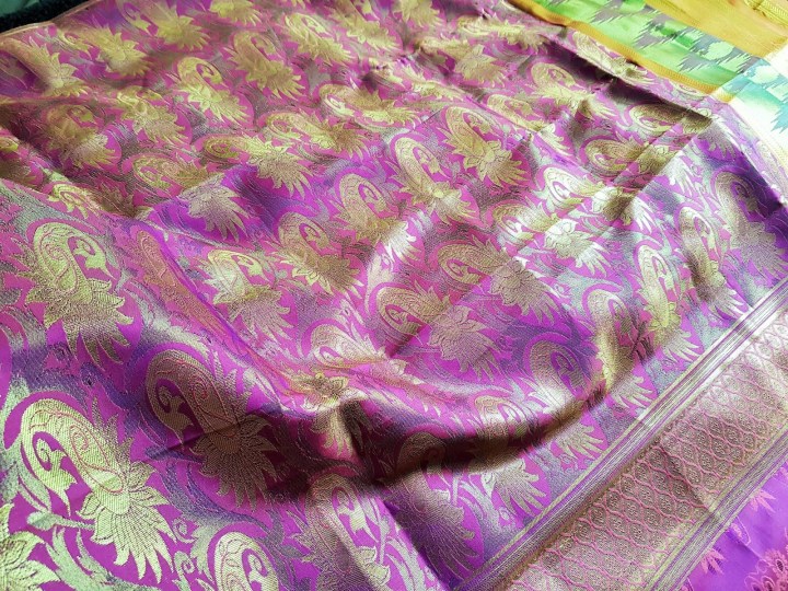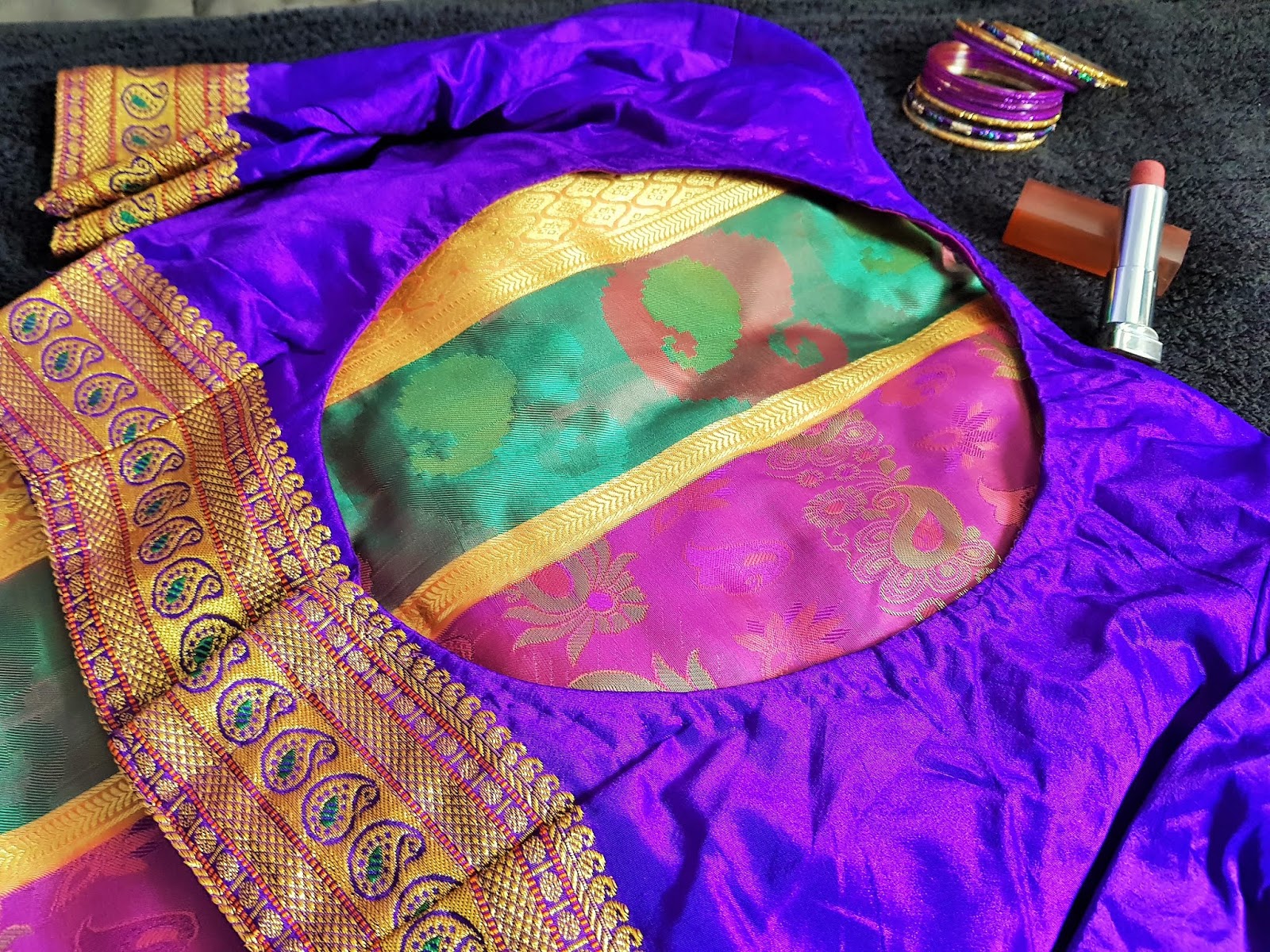 As I love bold and vibrant pop of colour, I matched this saree with a violet shade blouse, that had sleeve border with similar designs to that of saree border one.