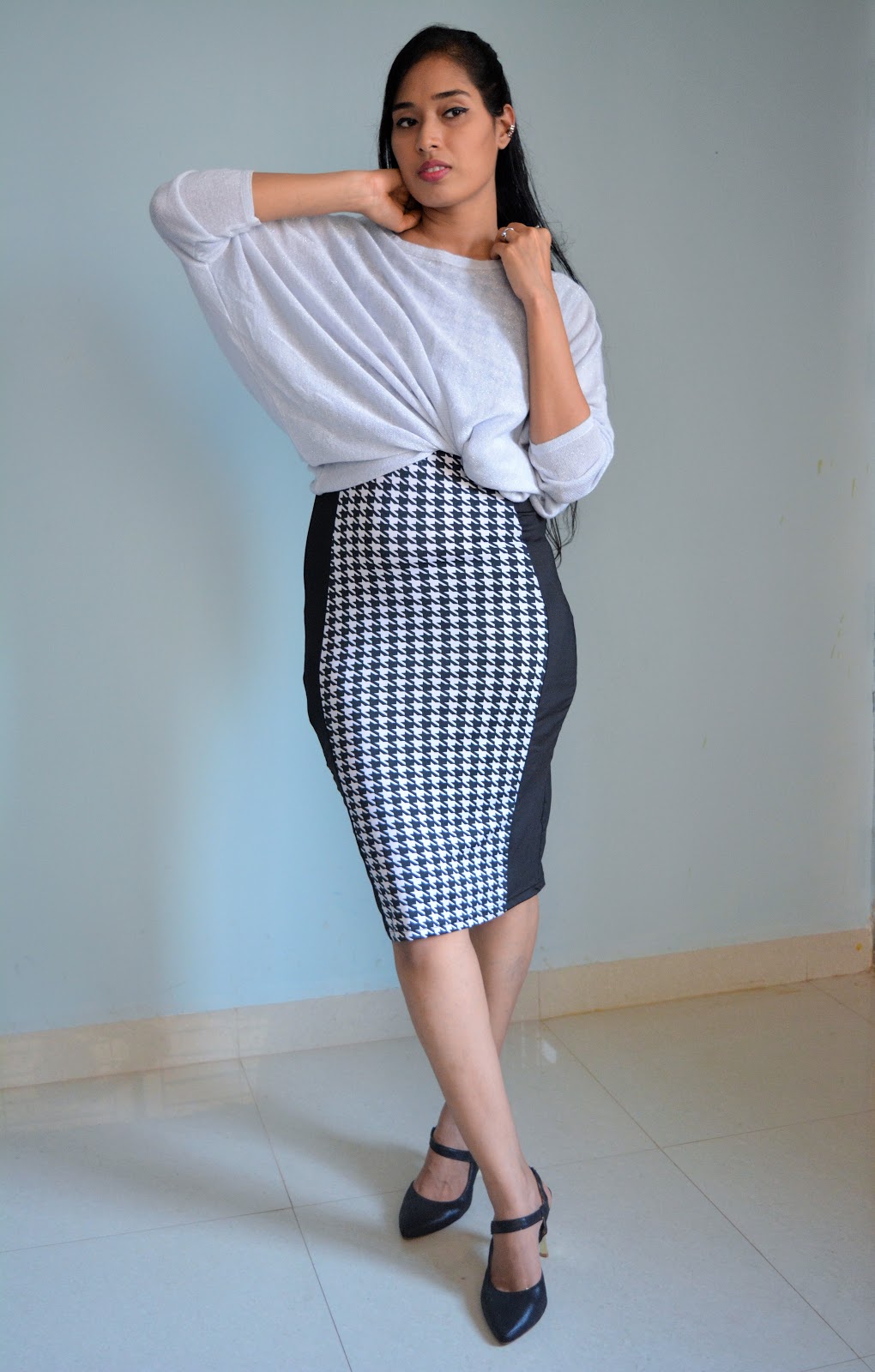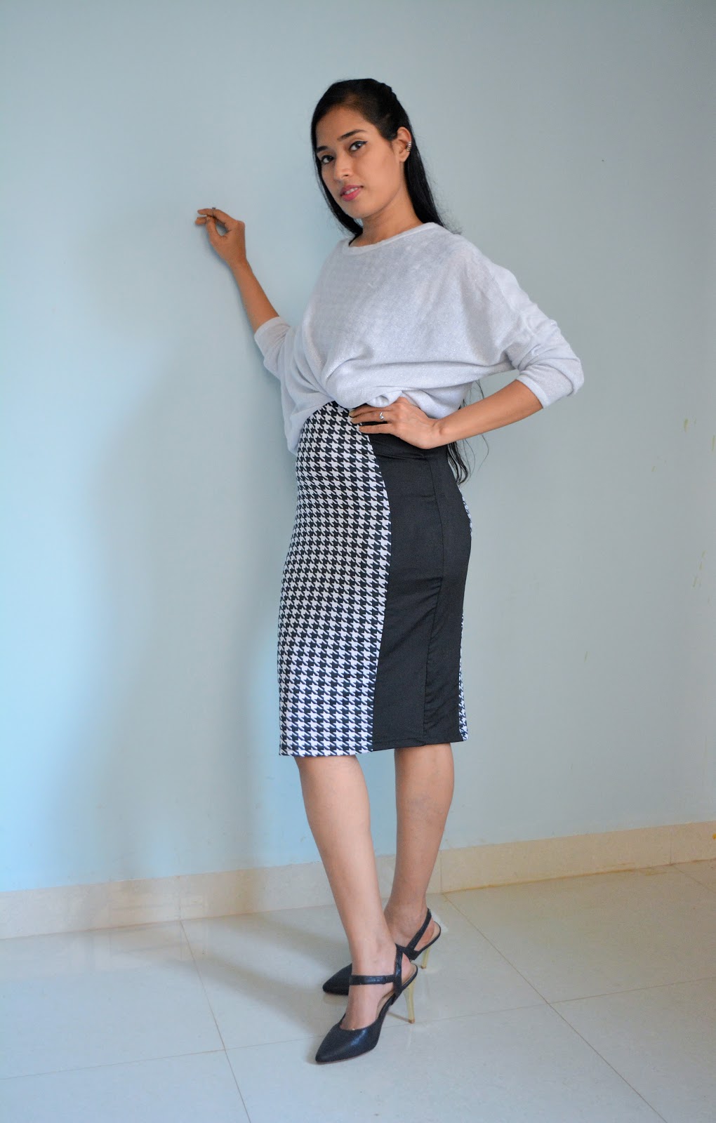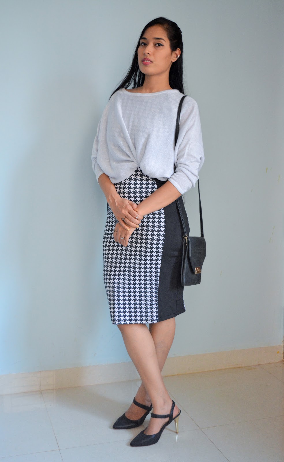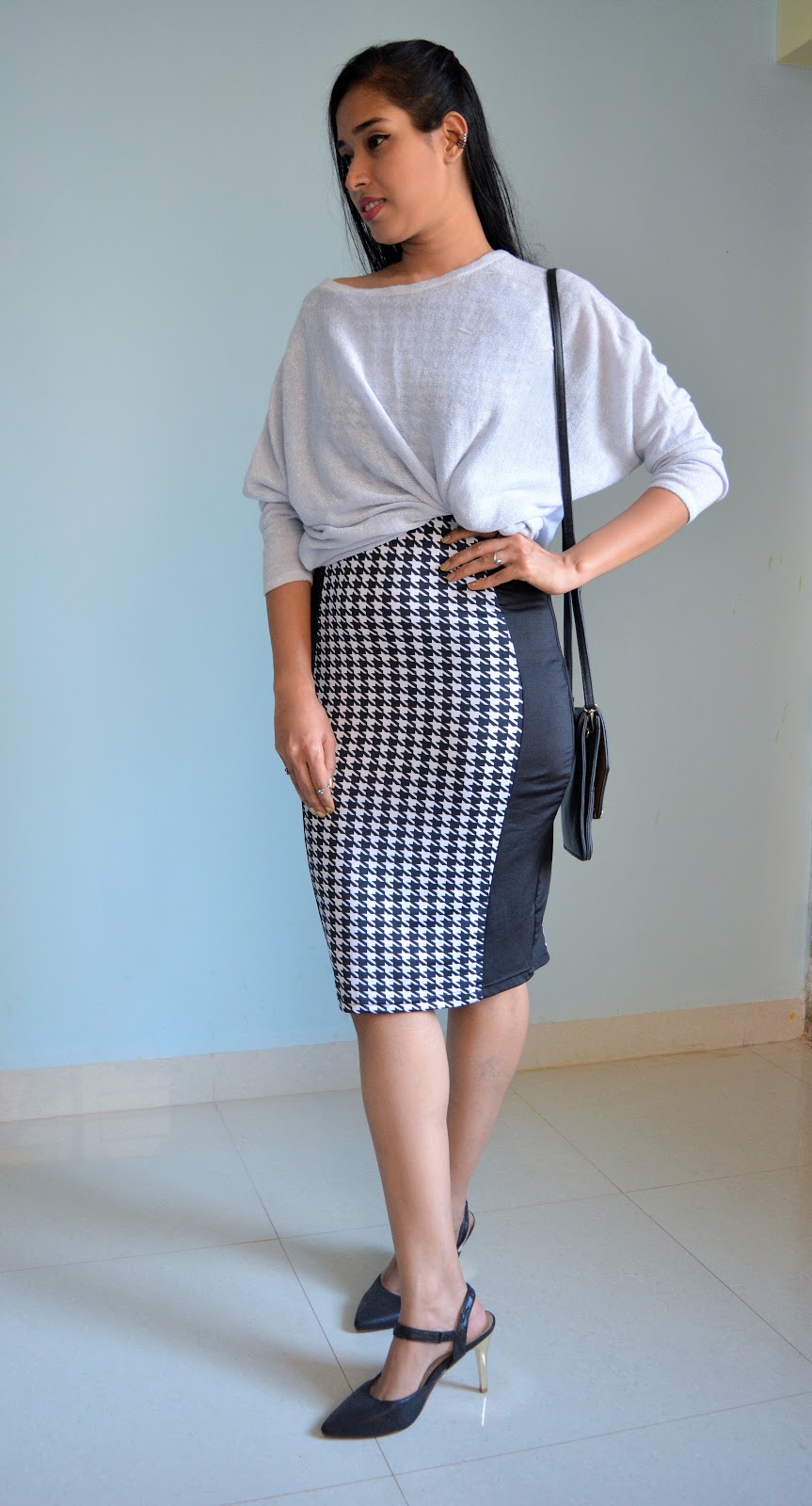 I styled my bodycon dress with minimal accessories and layered it with shiny, loose, off shoulder white top with side knot to achieve sparkling and polished attire.