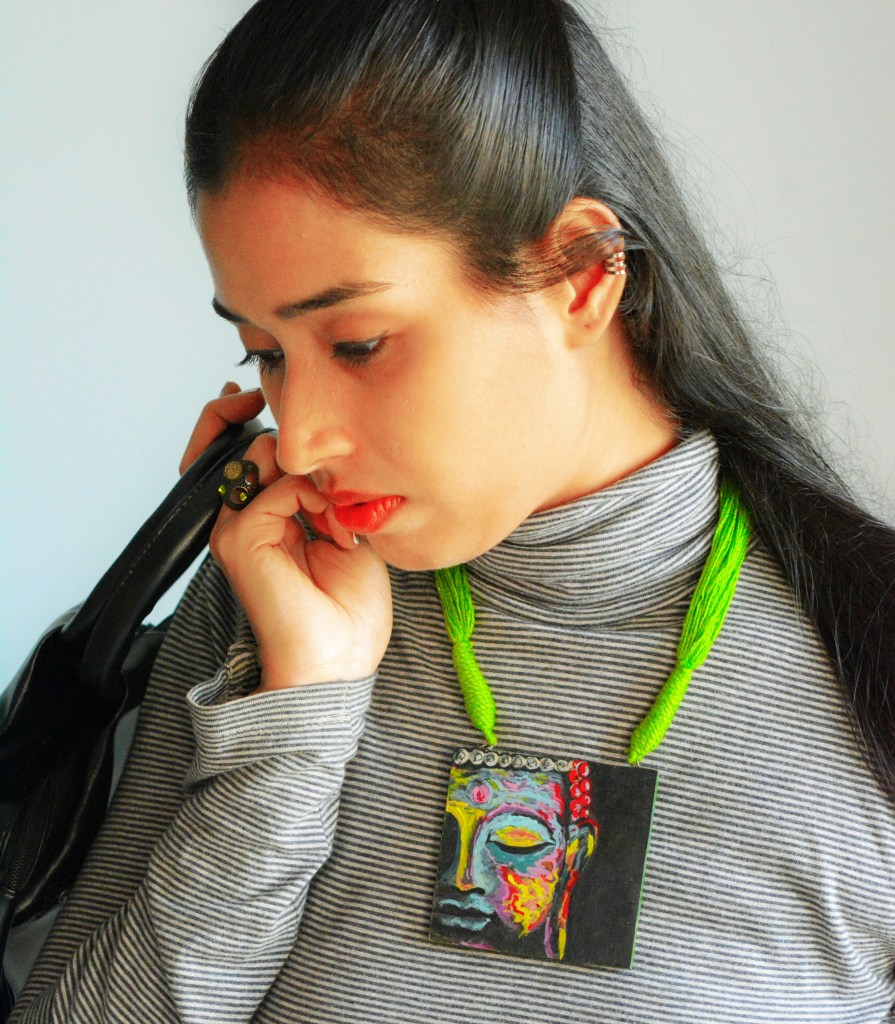 Why I said unique is because the necklace pendant is made of waste teak wood pieces. Also the Buddha image is itself painted by Veenaji. I also loved the play of different colors that so very well complimented each other.