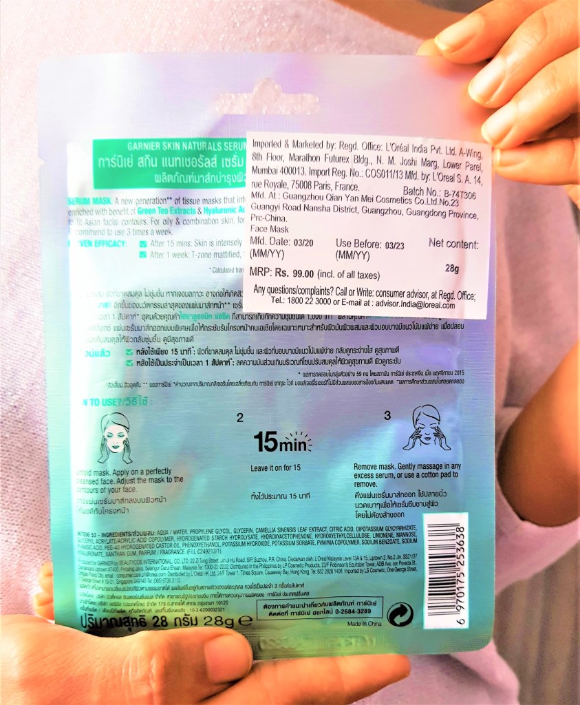 I was glad to pick Garnier’s Moisture Bomb Green Tea Hydrating Face Sheet Mask for oily, combination and sensitive skin which suited my skin type well. The sheet mask is said to be infused with green tea, hyaluronic acid and glycerin which works wonders on your skin. Also, Granier is a well known as well as trusted brand and so, was positive about the results. Hence, I thought to give it a try.