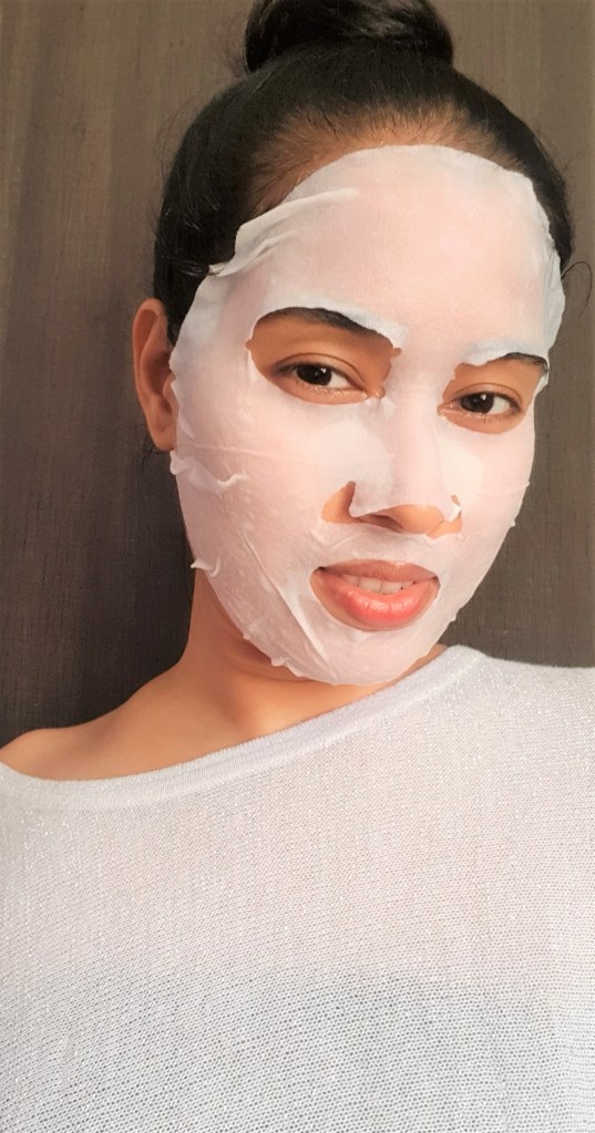 I would recommend using this tissue mask at night and leaving the face unwashed for best results. Thankfully my skin didn’t react negatively to the essence and I was glad to use it. The freshness of my face stayed for approx 3 hours. Overall, it was fun using a mask and the results was satisfactory.