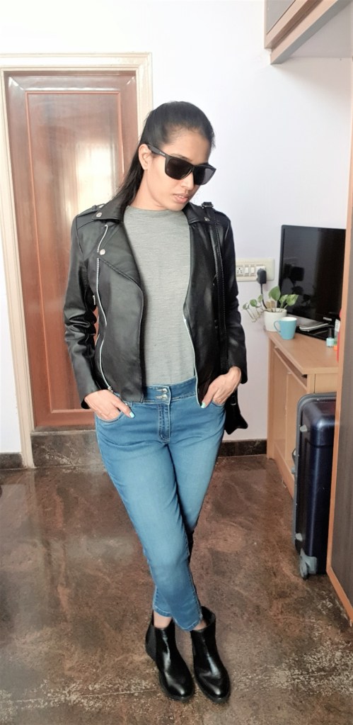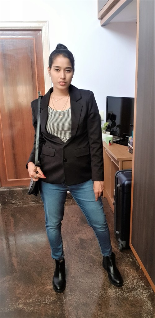 One of my favorite and easy go-to wear during any season is closed neck t-shirt or turtleneck top and a pair of jeans. As It’s easy to manage home and work life with these. Plus, I can instantly enhance my style by slipping on to a blazer, donning a descent footwear & grabbing a classic bag. You can also make your everyday look appear more interesting and stylish by playing around with the elements.