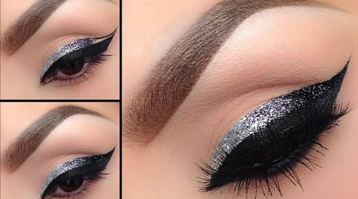 Draw black eyeliner onto upper eyelid & create a dramatic wing at the eye’s outer area to achieve this 70s sparkling eyeliner look. Then, above the eyeliner, apply silvery glitter eyeliner & allow it dry. This sparkling eye makeup is a fun & trendy and would be ideal for party.