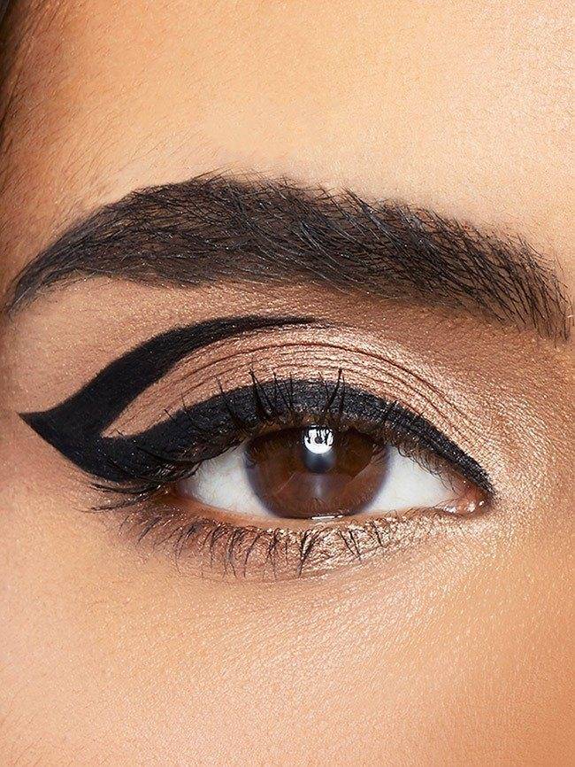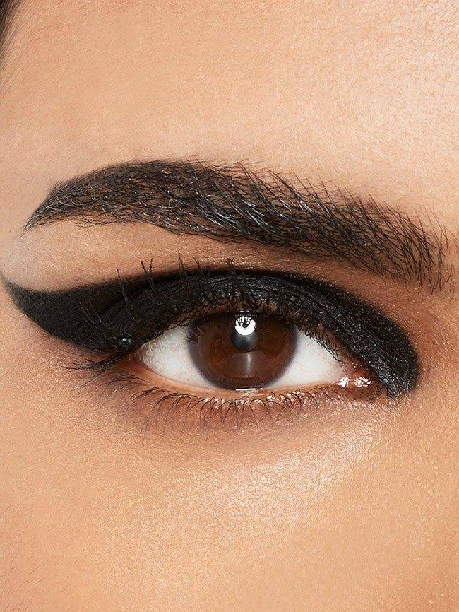 This look is created by covering the lower & upper eyelid with eyeliner. Start by applying a thin stroke to your inner section of the eye and gradually thicken the line at outer corner with a pointed wing at both ends.