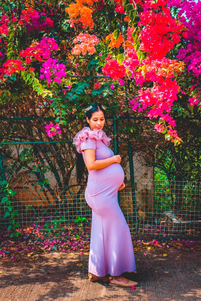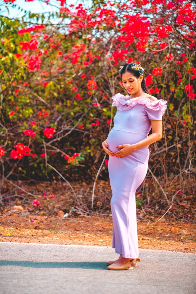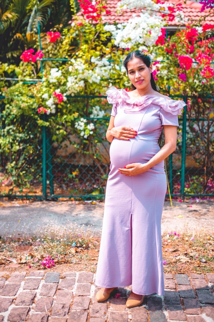 Make sure to choose an outfit which goes with your style and also that accentuates your baby bump. Surfing maternity pics from google and pinterest will also help you pick your perfect outfits for the shoot. So, one can choose their favourites, depending on their personal style as well as comfort level. I loved the pics with gown/ flowy dress as well as bodycon dress, so opted for the same.