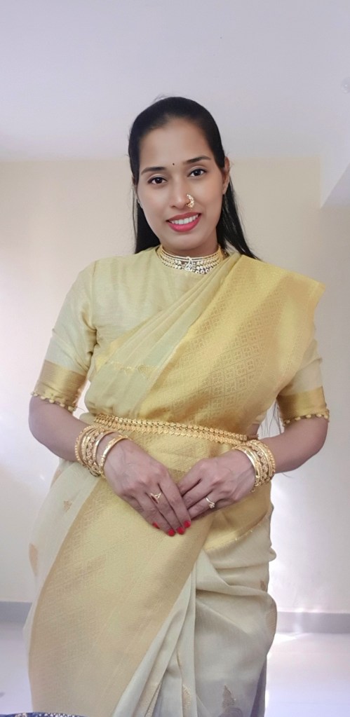 I wore this only for Varamahalakshmi pooja with a green color blouse that did not belong to this saree and was not that happy with the combination. As I wanted to wear it with the proper saree blouse allotted to this gorgeous one. Since the blouse and saree colors were similar, I got the desired monochrome look that I was looking for.