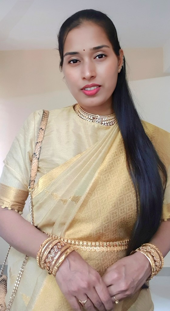 My guest wedding look was pretty must subtle with a pop of red on lips and nails. I am a huge fan of the subtle monochrome look, as it gives very much royal appeal. To create this, I opted for a gold-colored Banarasi Silk saree brought 3 years back and this is one of my favorite saree.
