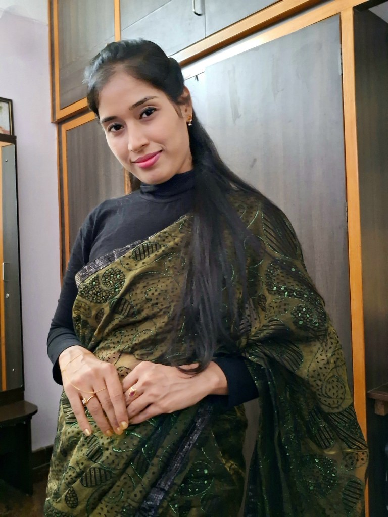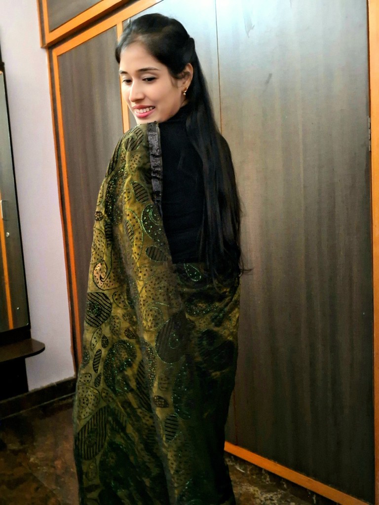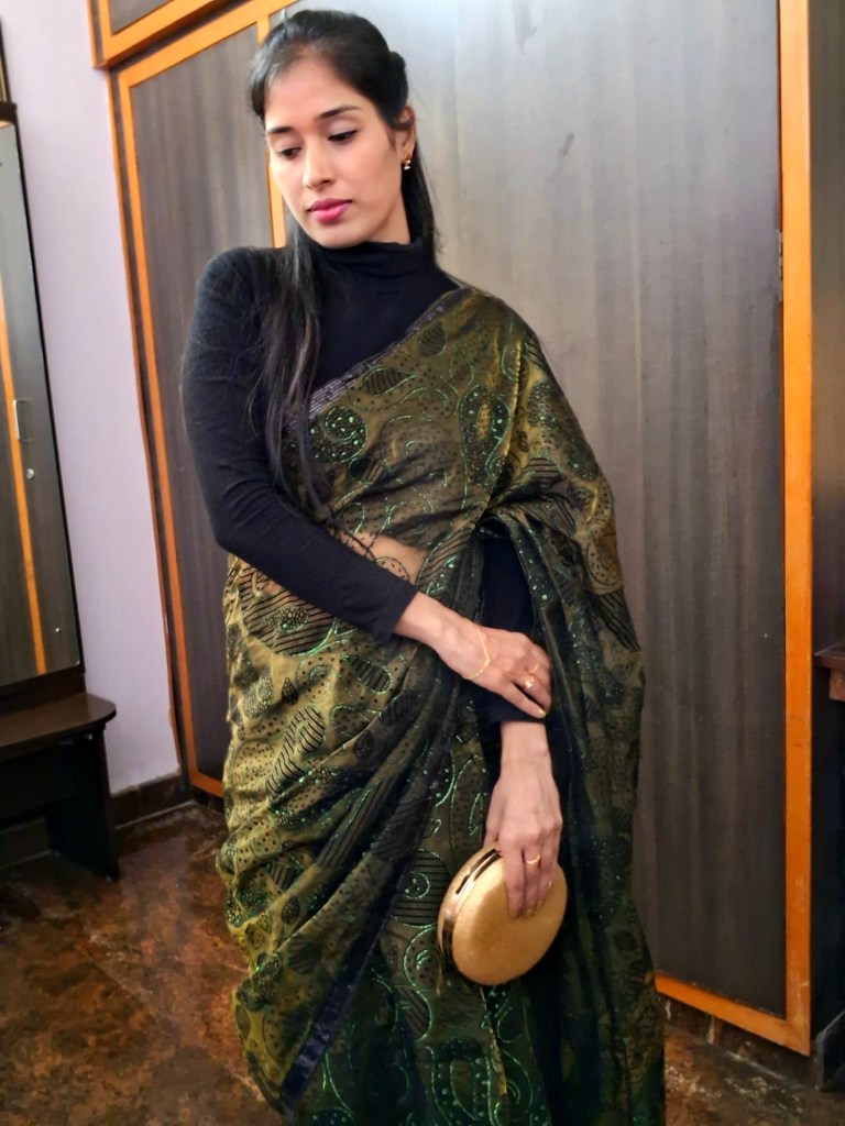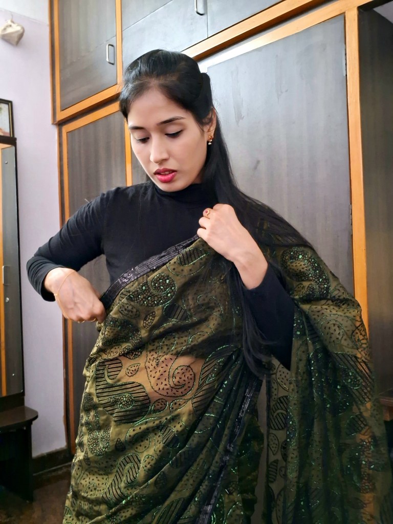 I picked up this shimmering olive green net saree which seemed the best option for me. This saree has all the elements that suit party events greatly, be it shimmer, shine, or sheer.