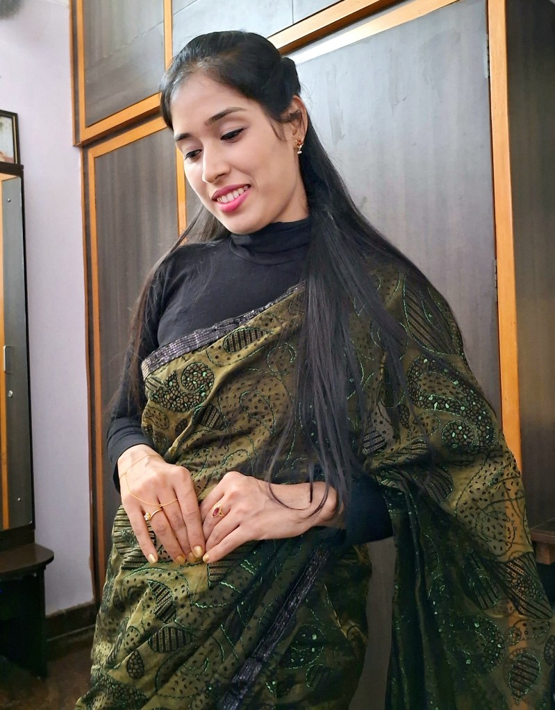 Long sleeves and closed-neck blouse patterns are on trend these days. So, I paired this graceful saree with a turtle neck and a long-sleeved black top for the poised look ( the bottom part of the top was folded to the blouse length).