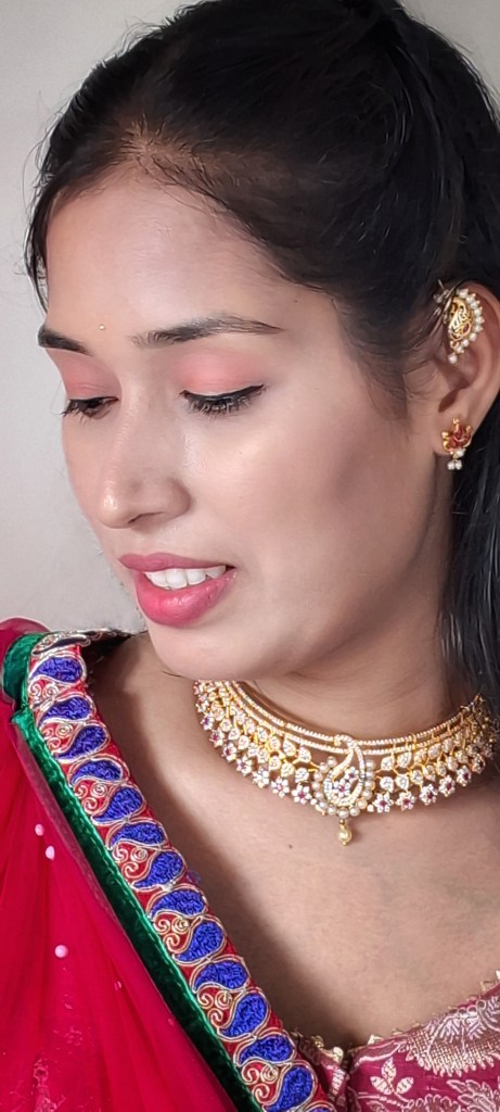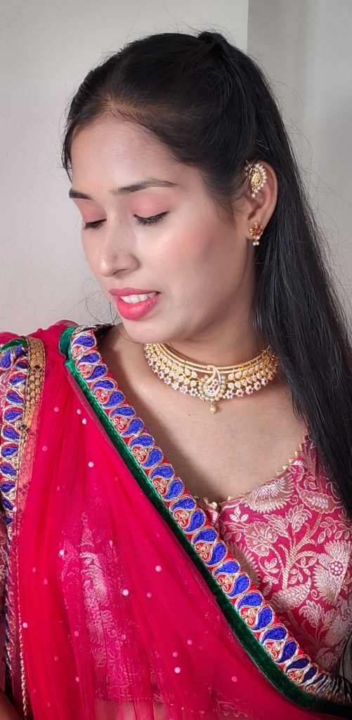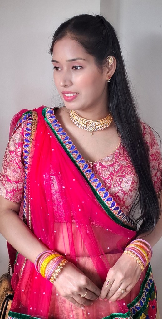 Being a mom, getting ready for function is a big challenge as I am interrupted by my toddler now and then. Hence, draping a saree is a big no as it takes too much time. Finally, I settled down to a lehenga choli over a salwar suit as it didn’t have a feeding option.