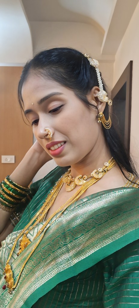 I opted for a hairstyle that suited well with the pakke hair accessory. However, a bun and the navari define the goan traditional look. I had to opt for something quicker to get into my heels. Bun hairstyle and navari drape are a little tricky and I would need help. So had to drop the idea.