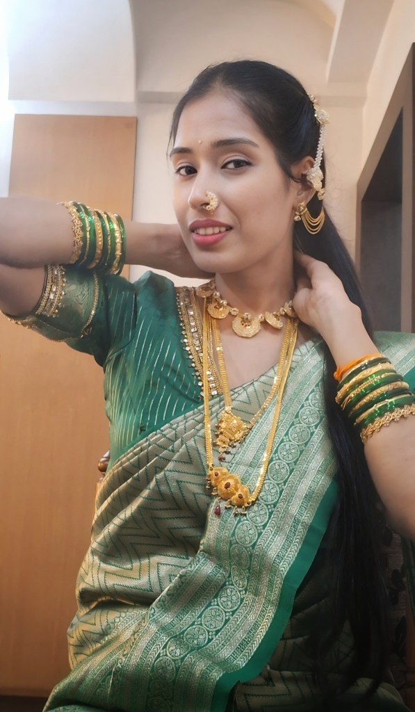 I curated my wedding guest look by draping this beautiful, green banasari silk saree with traditional goan jewelry. Pakke hair accessory, pakke haar and nath gelled gorgeously with my saree and were a match made in heaven. This statement piece gave a unique touch to my look for a south Indian wedding.