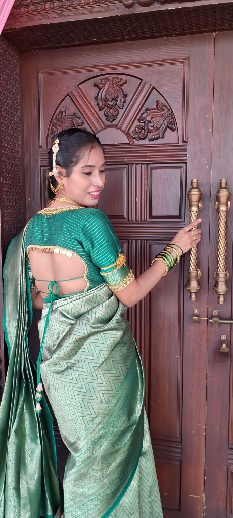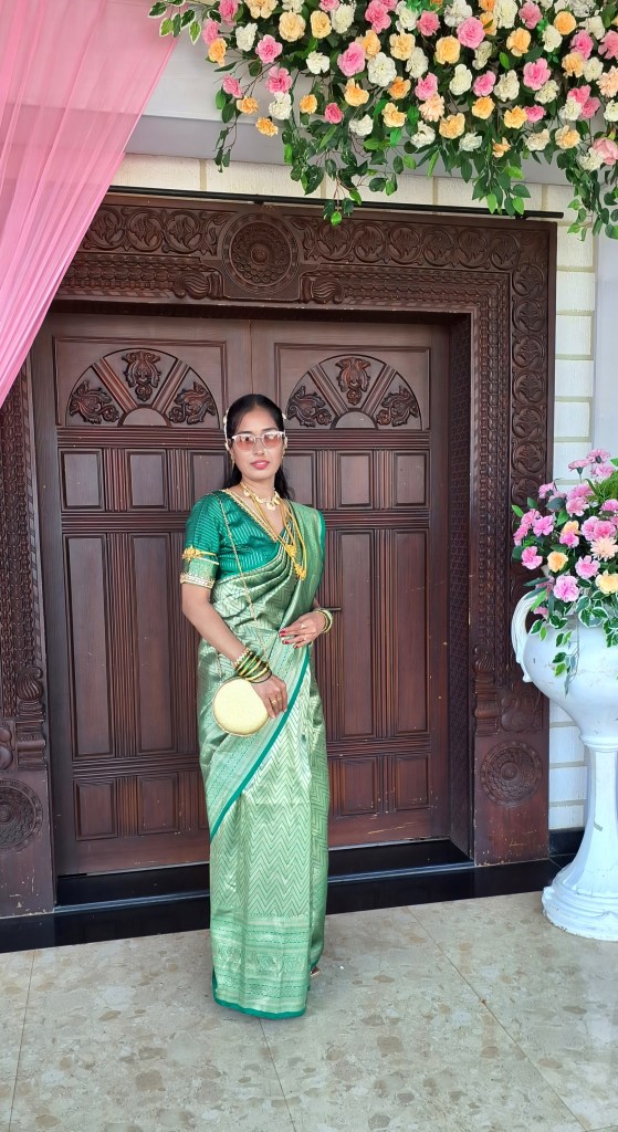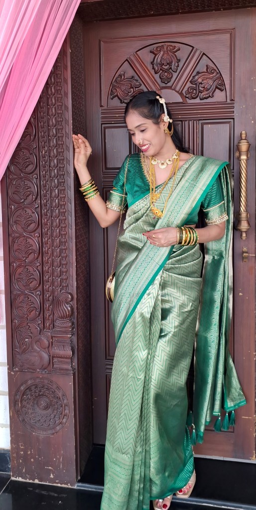 The green glass bangles were the classic match for my saree. The gold clutch and comfortable kitten heels were my go-to picks with no doubt at all.