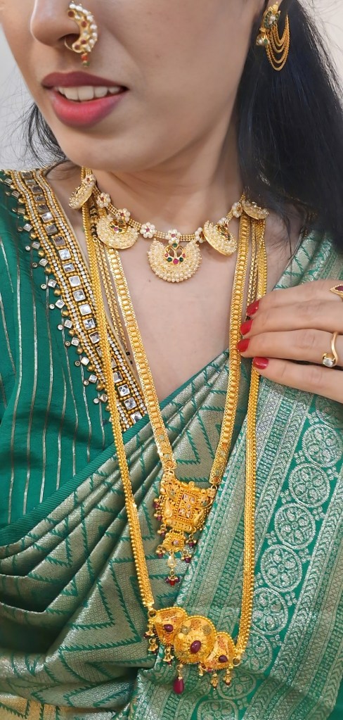 Your accessories should complement, not overpower, your saree. Jewelry: Choose a statement necklace or earrings, but not both. Opt for traditional pieces like jhumkas or temple jewelry for a classic look. Clutch: A small, embellished potli bag or a metallic clutch can complete the ensemble. Footwear: Heels or embellished juttis pair beautifully with sarees.