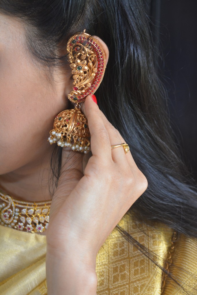 - Bridal Look: Choose an opulent gold or Kundan Kaan earcuff set with pearls and gemstones to complement traditional bridal wear.