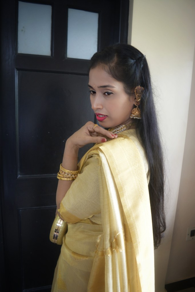 A day wedding look with a gold saree and kaan earcuffs, needs a balance of elegance and freshness. Here’s how you can style it: