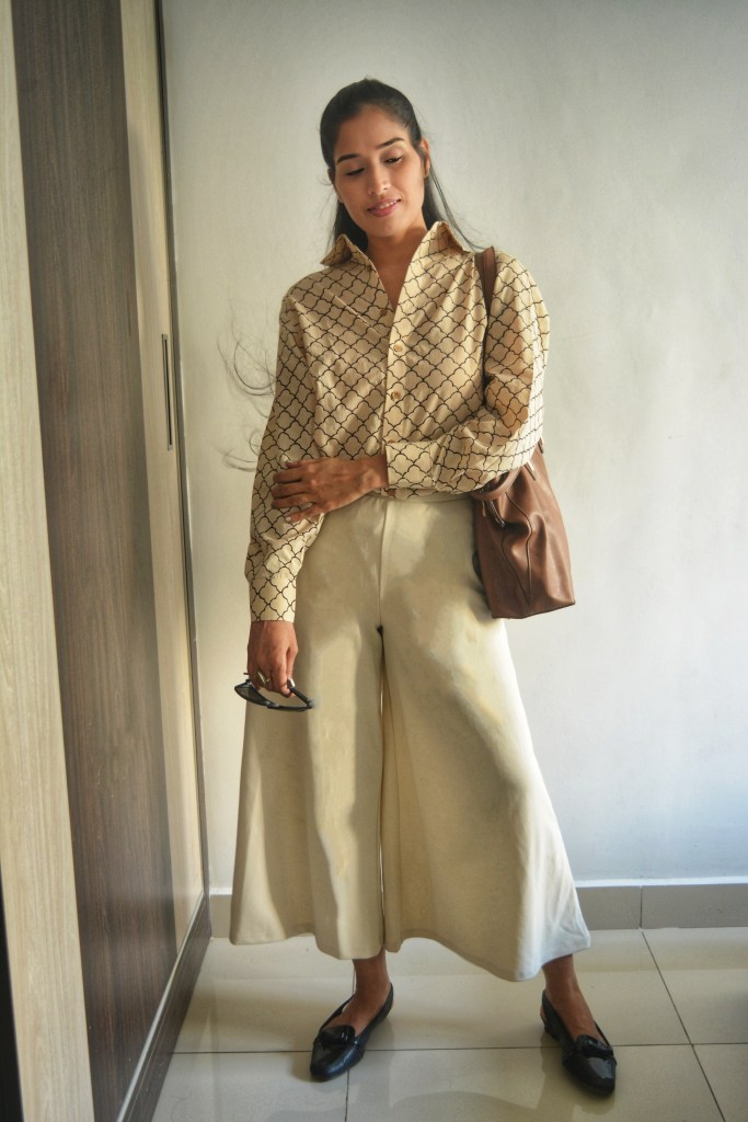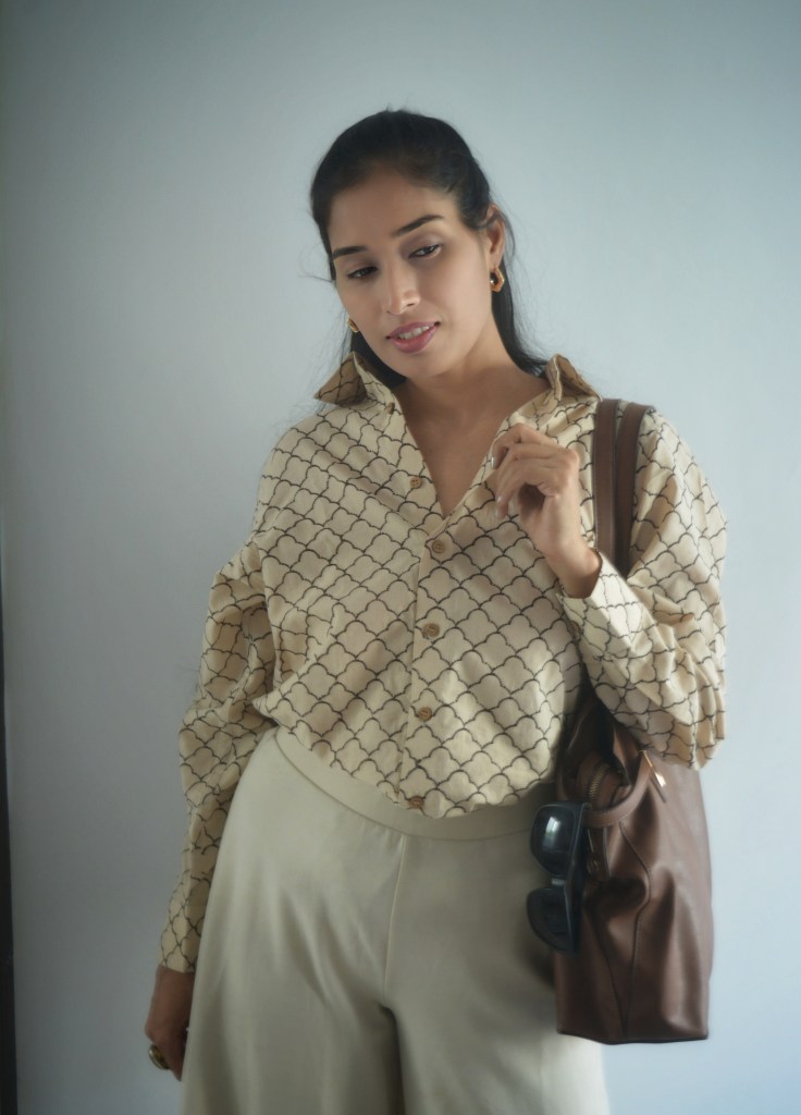This shirt adorned with a delicate hand-blocked fish scale print that’s structured yet soft, strikes the perfect balance between classic and modern. I paired this pretty shirt with wide-leg cream culottes, which I’m currently obsessed with. This flowy silhouette adds drama and allows effortless movement, helping in beating the heat, making it ideal for a day out in the city. The outfit radiates comfort without compromising on sophistication.