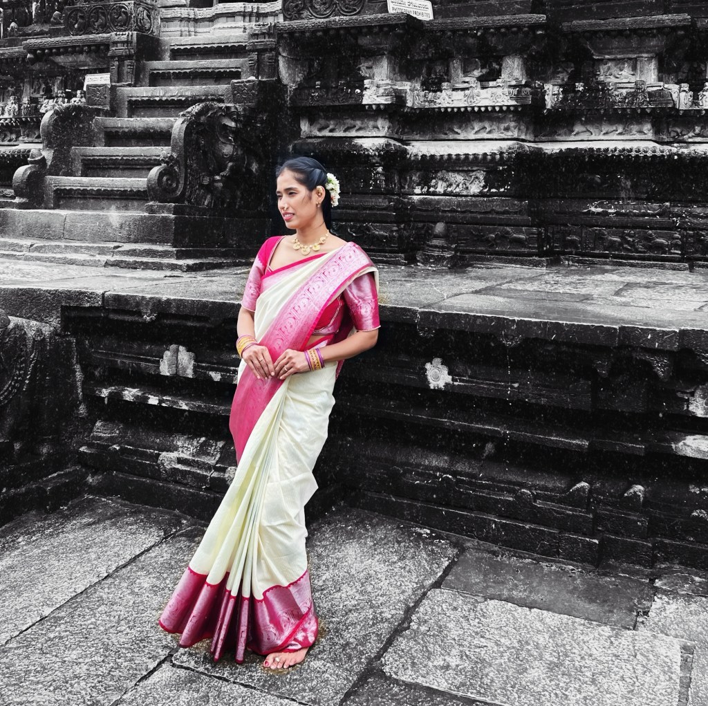 One of my favorite shots was captured against the serene backdrop of the temple premises, where the timeless architecture enhanced the grace of the saree. It added both divinity and warmth to the entire look.