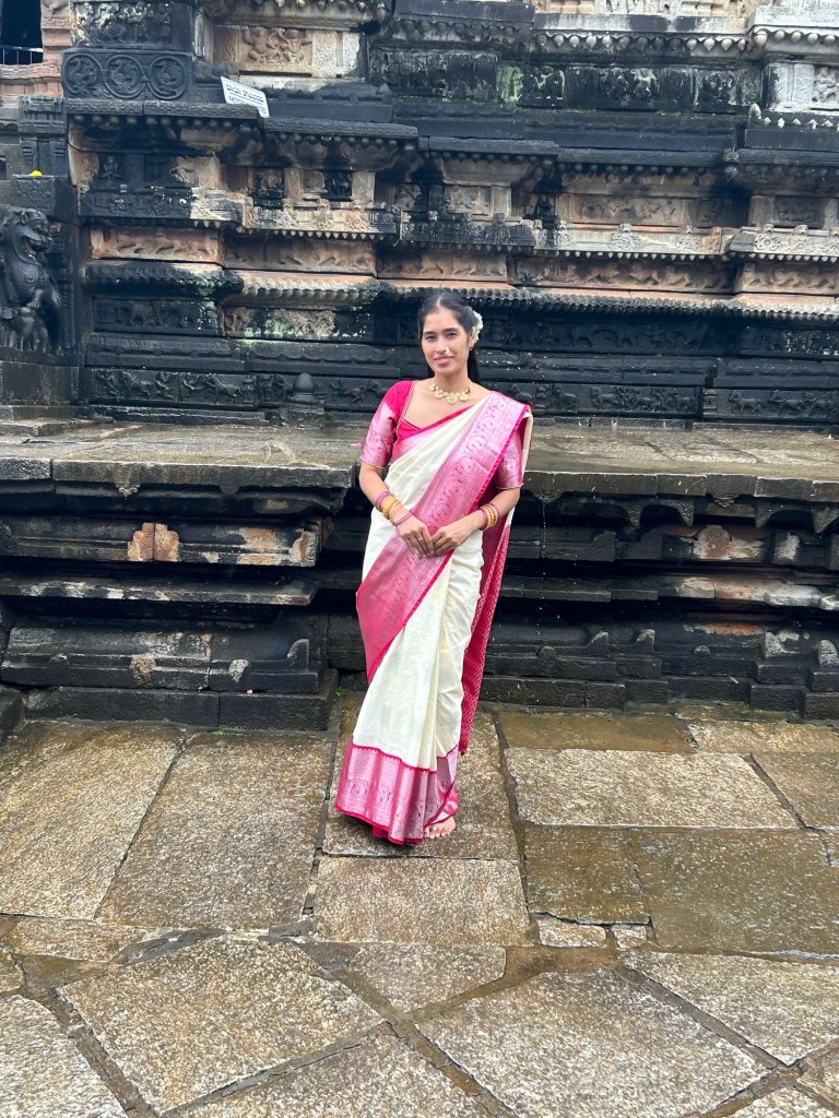 Standing in the temple premises with the serene backdrop of sacred architecture, I felt a mix of joy, gratitude, and pride. This saree wasn’t just attire, it became a vessel of memory, a reminder of the love and blessings surrounding my son’s first step into education.