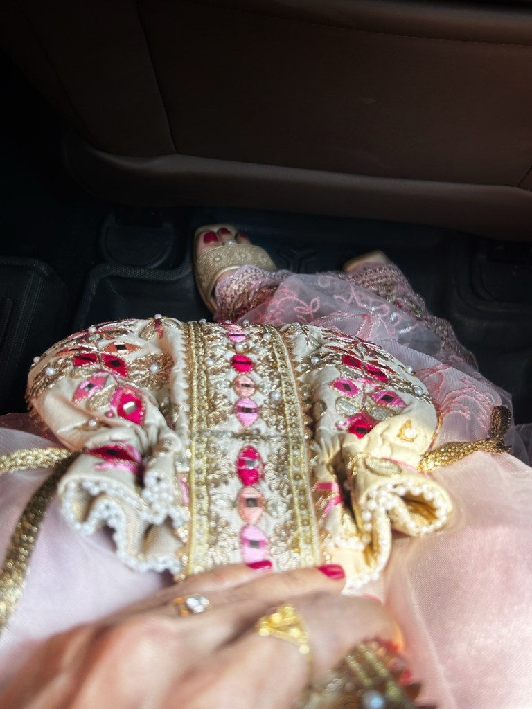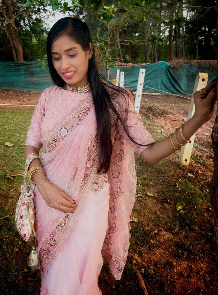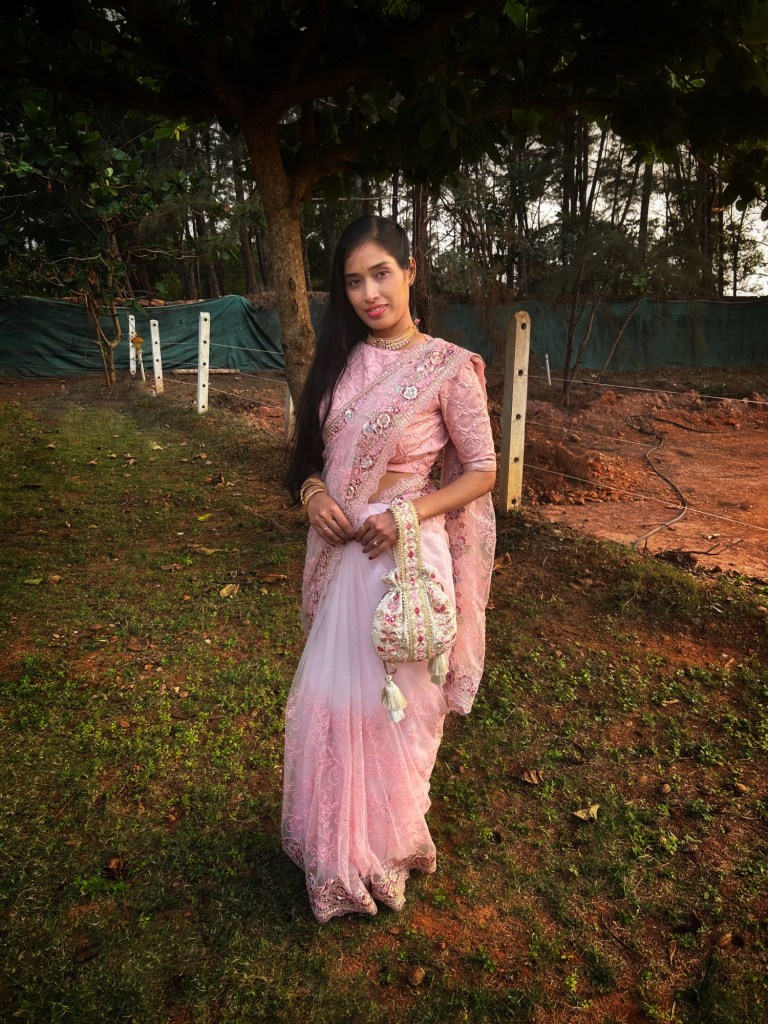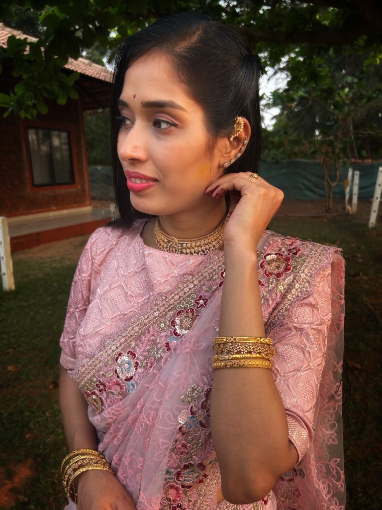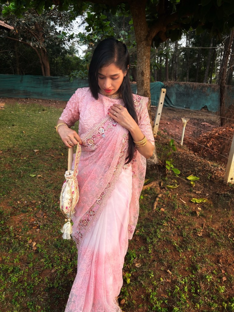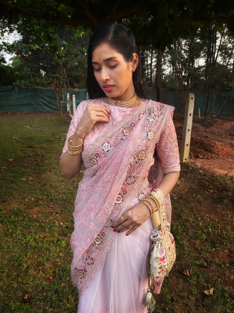 After looking through a few options, I kept coming back to this soft blush pink saree. It had a delicate elegance that felt perfect for the occasion — festive but still graceful and effortless.