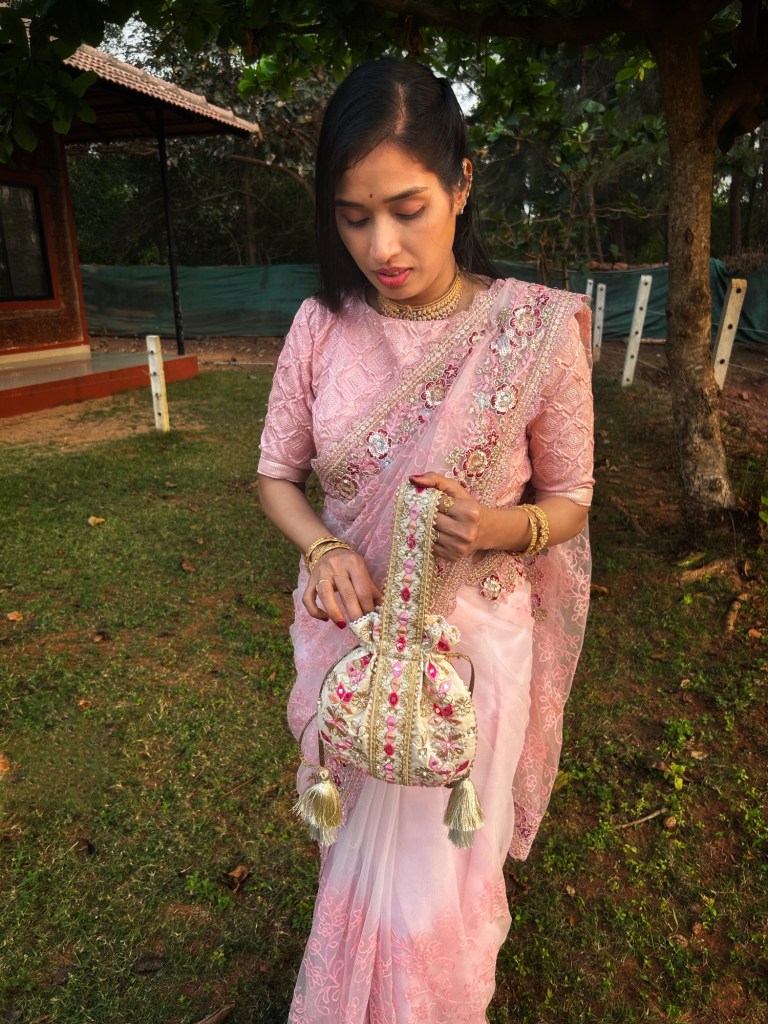 Potli bags always add that traditional charm to Indian outfits, and this one blended beautifully with the delicate embroidery of the saree.